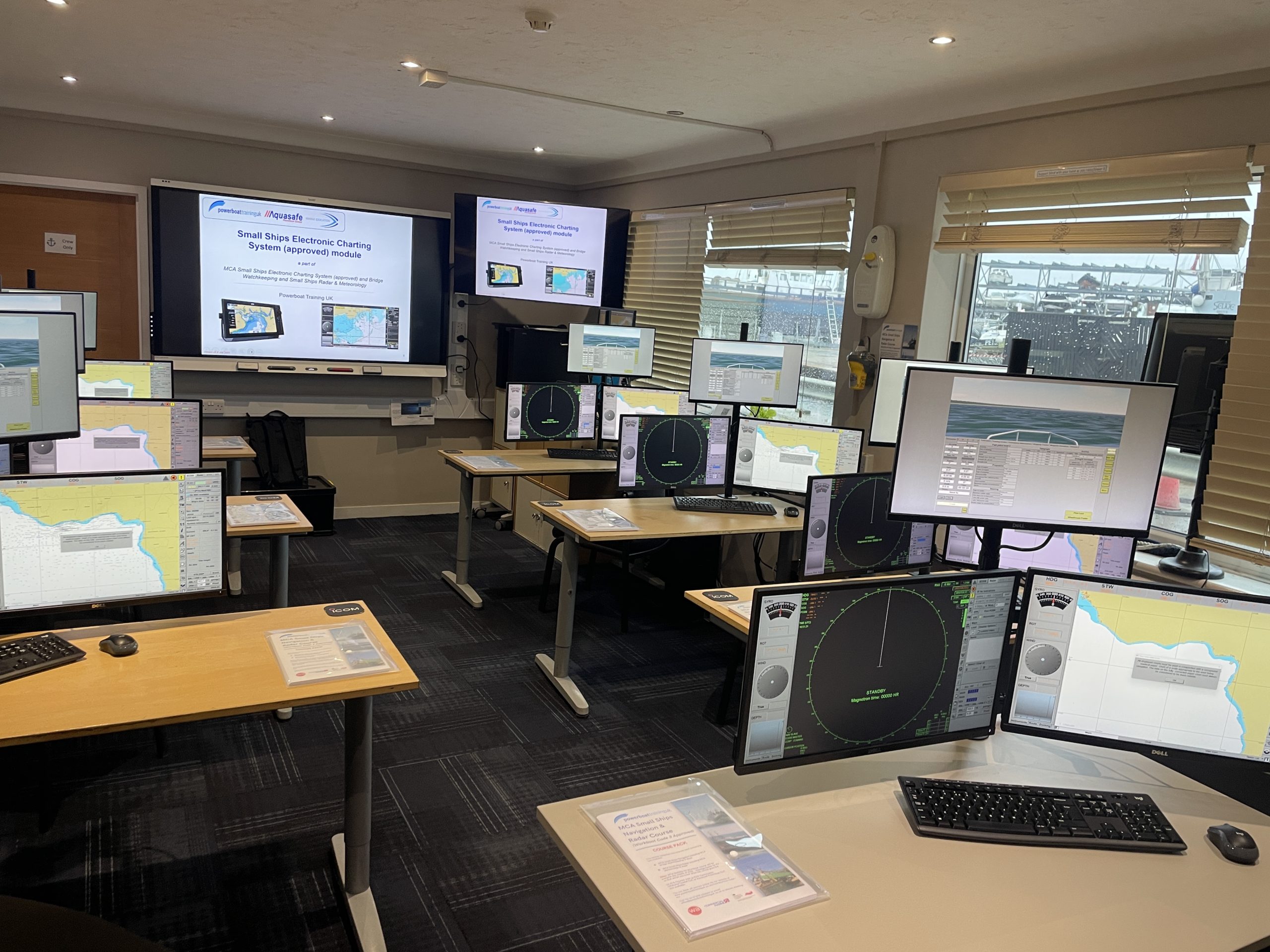 In terms of equipment we have invested heavily to ensure that we create the best training environment for this course. Our Wartsila/Transas Navi-Sailor training setup has 6x (Poole) or 8x (Southampton) student workstations (plus 1x instructor station) each running a three screen setup reflecting the typical layout on a vessel – radar display, chartplotter display and front screen/boat controls.